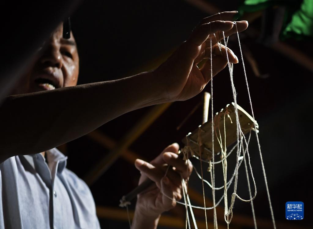 在江西省廣昌縣塘坊鎮大株村,木偶劇團團長(cháng)謝幫銀在表演木偶戲(8月10日攝)。