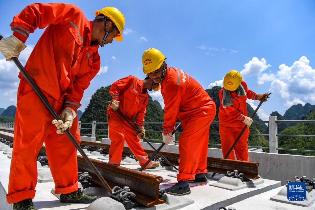 8月16日,在貴南高鐵廣西段龍江雙線(xiàn)特大橋鋪軌作業(yè)現場(chǎng),工作人員在進(jìn)行鋼軌對位作業(yè)。