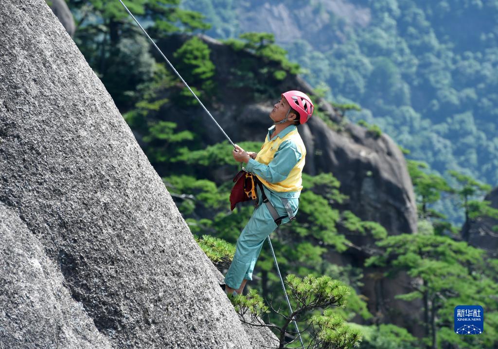 8月15日,李培生在黃山風(fēng)景區的懸崖峭壁間清撿垃圾。