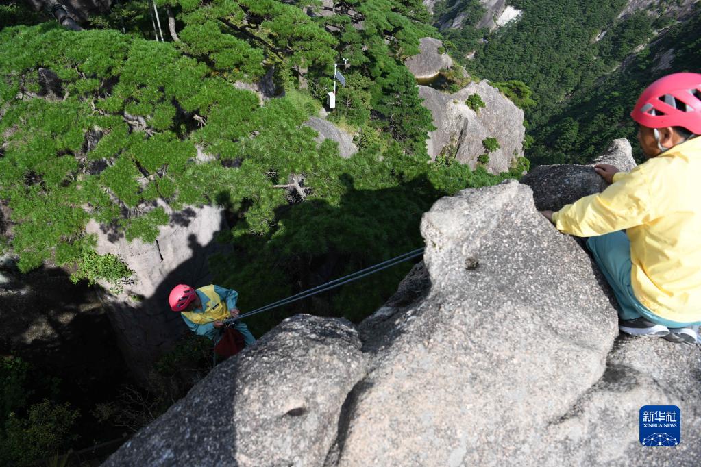 8月15日,李培生(左)在黃山風(fēng)景區的懸崖峭壁間清撿垃圾。