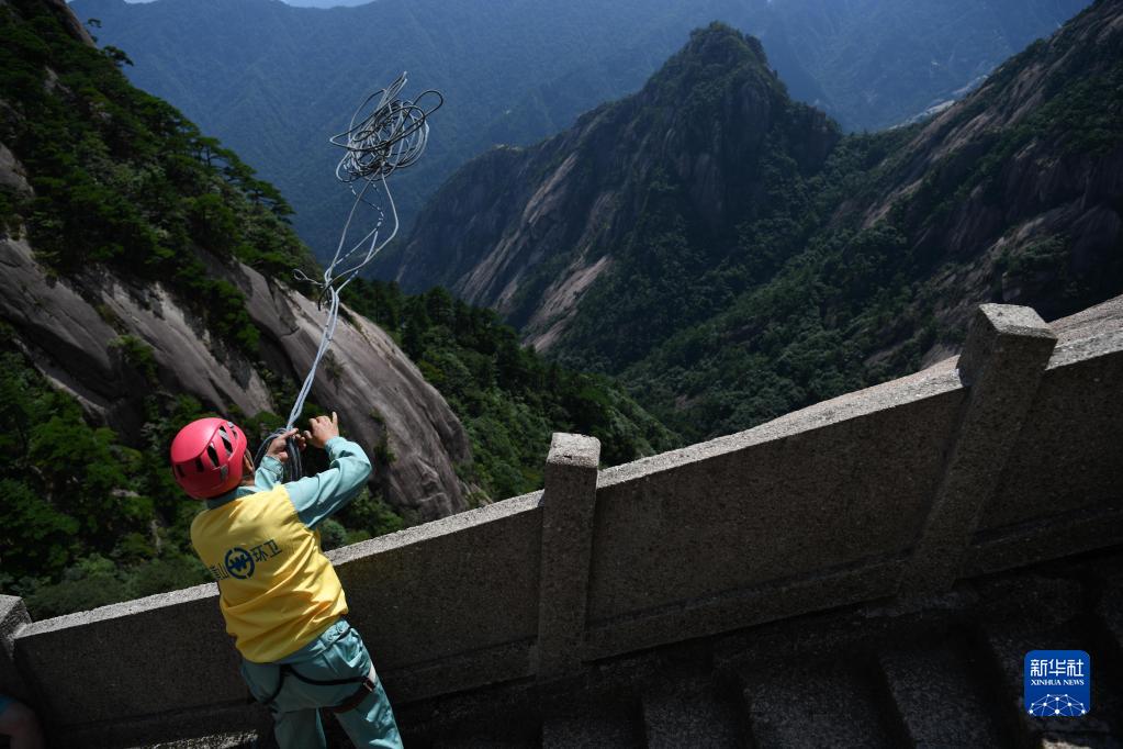 8月14日,李培生在黃山風(fēng)景區放繩準備清撿垃圾。