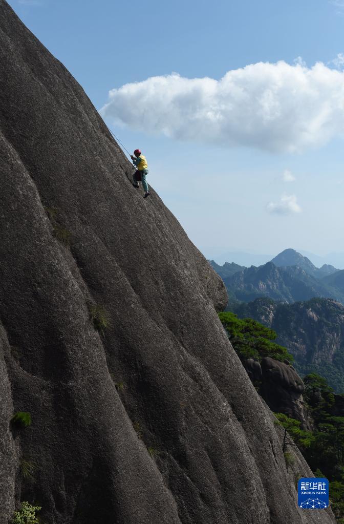 8月15日,李培生在黃山風(fēng)景區的懸崖峭壁間清撿垃圾。