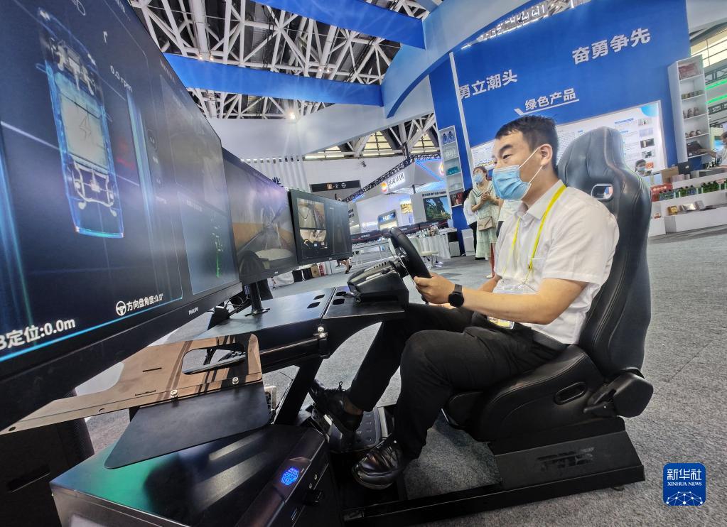 8月16日,在第六屆絲綢之路國際博覽會(huì )陜煤集團展位上,參會(huì )者體驗5G+無(wú)人駕駛膠輪車(chē)系統。