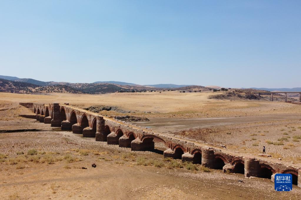 這是8月15日用無(wú)人機拍攝的干涸的西班牙錫哈拉水庫,上世紀50年代因水庫落成而被淹沒(méi)的梅斯塔古橋重見(jiàn)天日。