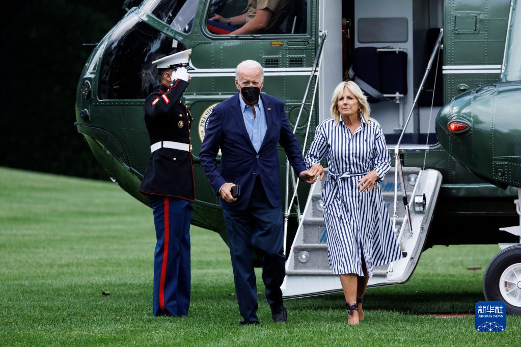 這是8月8日在美國華盛頓白宮拍攝的美國總統拜登(中)和第一夫人吉爾·拜登(右)。
