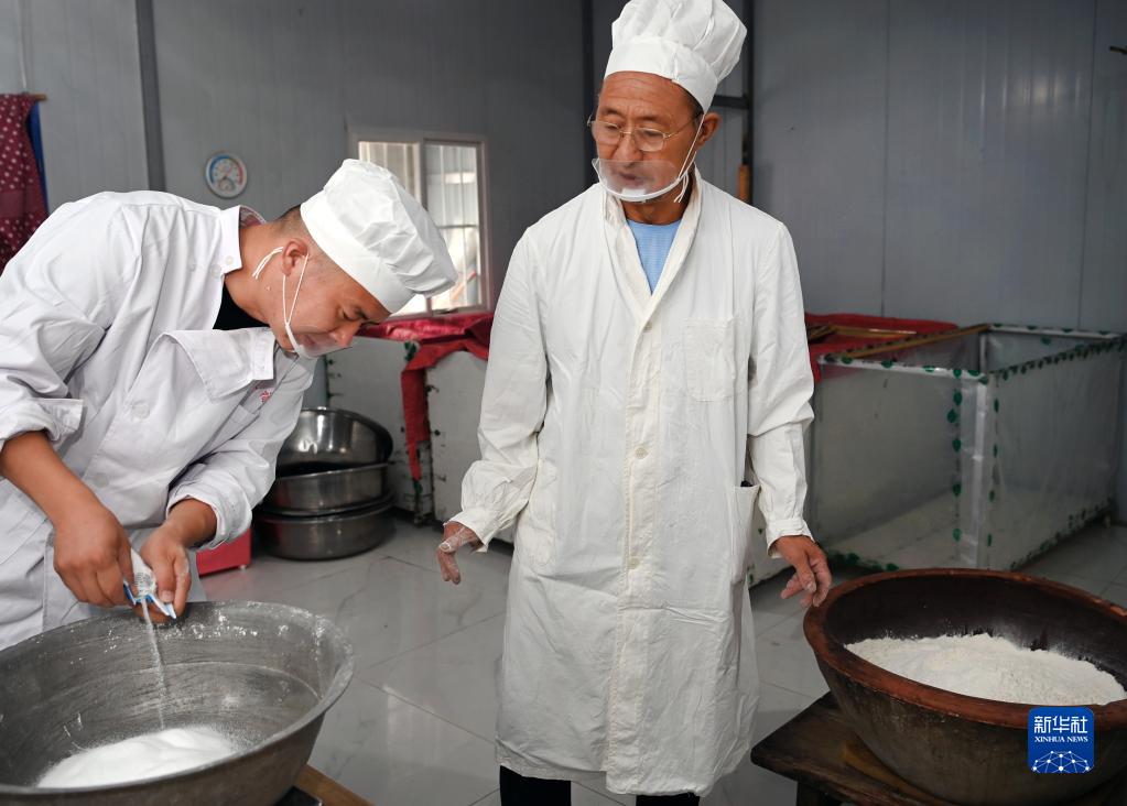 8月16日,李長(cháng)滿(mǎn)(右)和兒子李念平在準備制作空心掛面原料。