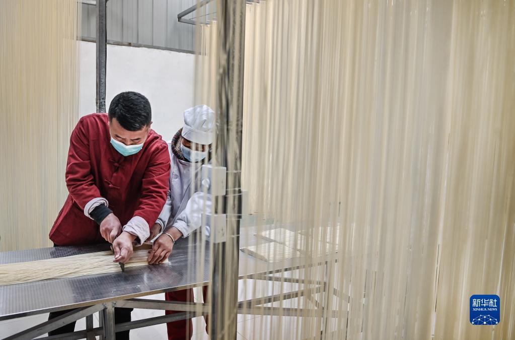 李念平(左)在整理半成品空心掛面(3月18日攝)。