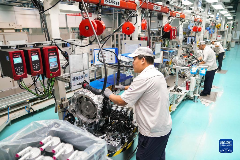在哈爾濱東安汽車(chē)動(dòng)力股份有限公司生產(chǎn)車(chē)間,工人在生產(chǎn)作業(yè)(8月16日攝)。
