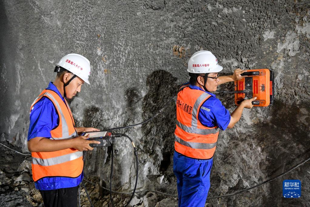 8月16日,在位于廣西環(huán)江毛南族自治縣的貴南高鐵九萬(wàn)大山四號隧道內,技術(shù)人員使用檢測設備對隧道初期支護背后空洞進(jìn)行檢測,確保隧道作業(yè)安全。