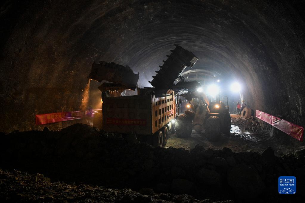 8月17日,在位于廣西環(huán)江毛南族自治縣的貴南高鐵九萬(wàn)大山四號隧道內,挖掘機在清理隧道貫通爆破后產(chǎn)生的土石方。