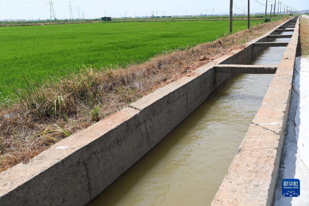 在江西省永修縣三角鄉樹(shù)下村,稻田旁的水渠內灌溉用水流淌(8月16日攝)。
