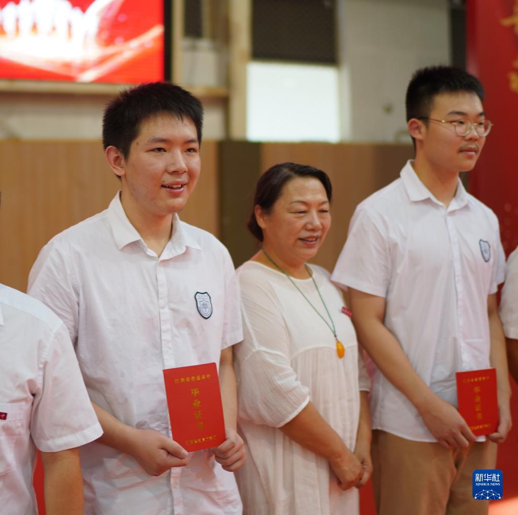 在位于南昌的江科附中高中部畢業(yè)典禮上,劉熙鴻(左)上臺領(lǐng)取畢業(yè)證書(shū)(8月13日攝)。