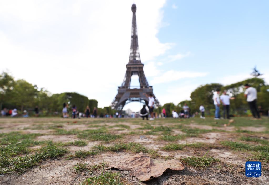 這是8月17日在法國巴黎戰神廣場(chǎng)拍攝的干枯的草坪和干枯脫落的樹(shù)葉。