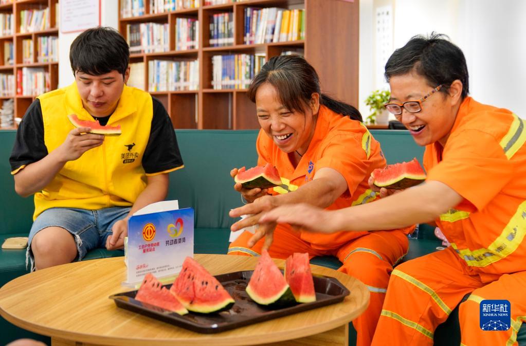 8月17日,重慶市九龍坡區謝家灣街道萬(wàn)象城的工會(huì )戶(hù)外勞動(dòng)者服務(wù)站內,環(huán)衛工人品嘗工會(huì )送到服務(wù)站的西瓜。