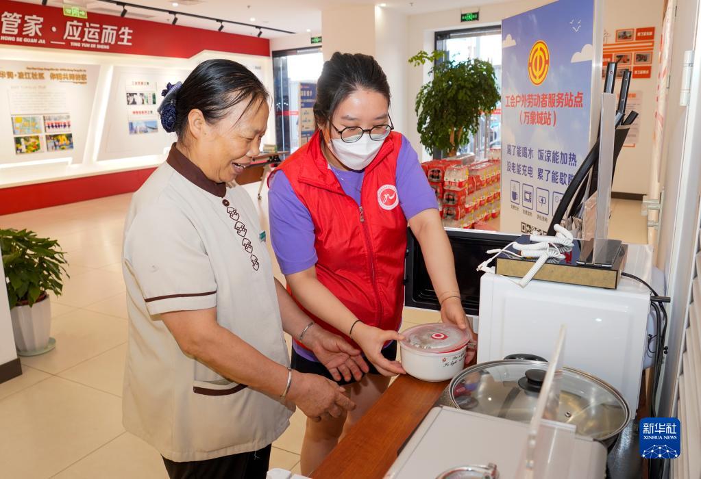 8月17日,重慶市九龍坡區謝家灣街道萬(wàn)象城的工會(huì )戶(hù)外勞動(dòng)者服務(wù)站,志愿者幫助一名物業(yè)保潔人員加熱自帶的午餐。