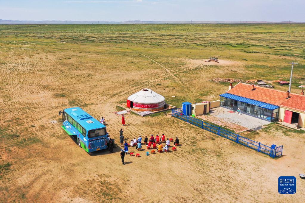 8月17日,在敦達烏蘇嘎查演出點(diǎn),烏蘭牧騎隊員在給觀(guān)眾表演節目(無(wú)人機照片)。