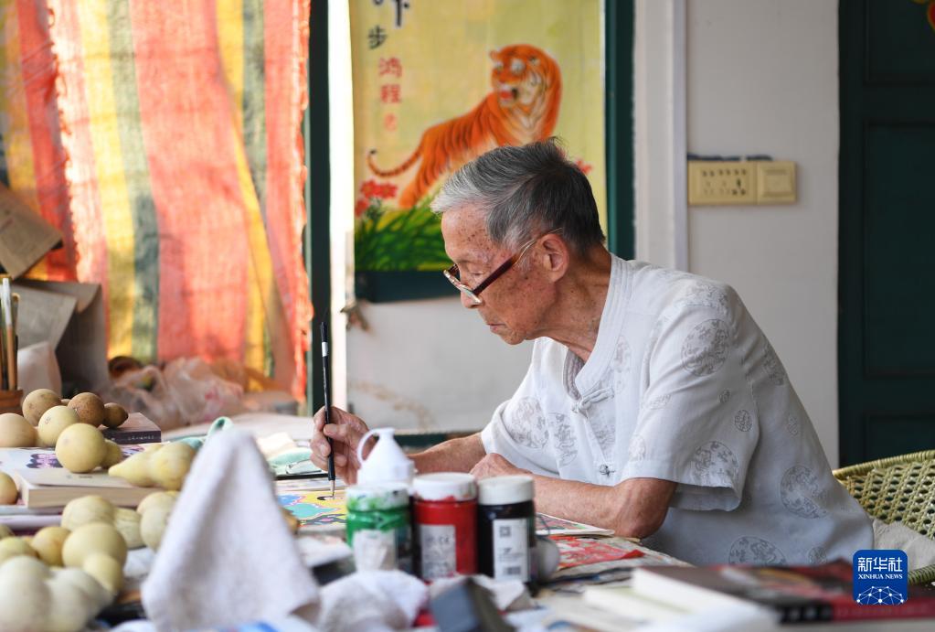 8月17日,在河南省漯河市舞陽(yáng)縣九街鎮胡崗村,農民畫(huà)畫(huà)家胡振亞在創(chuàng )作。