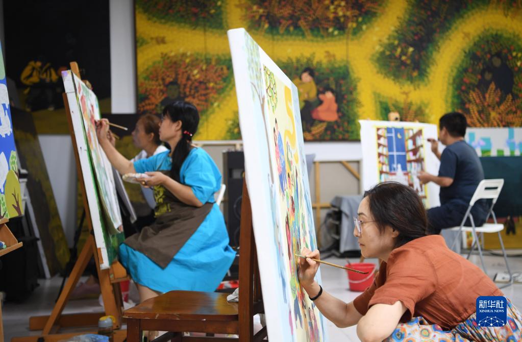 8月17日,在河南省漯河市舞陽(yáng)農民畫(huà)院,畫(huà)家們在創(chuàng )作農民畫(huà)。
