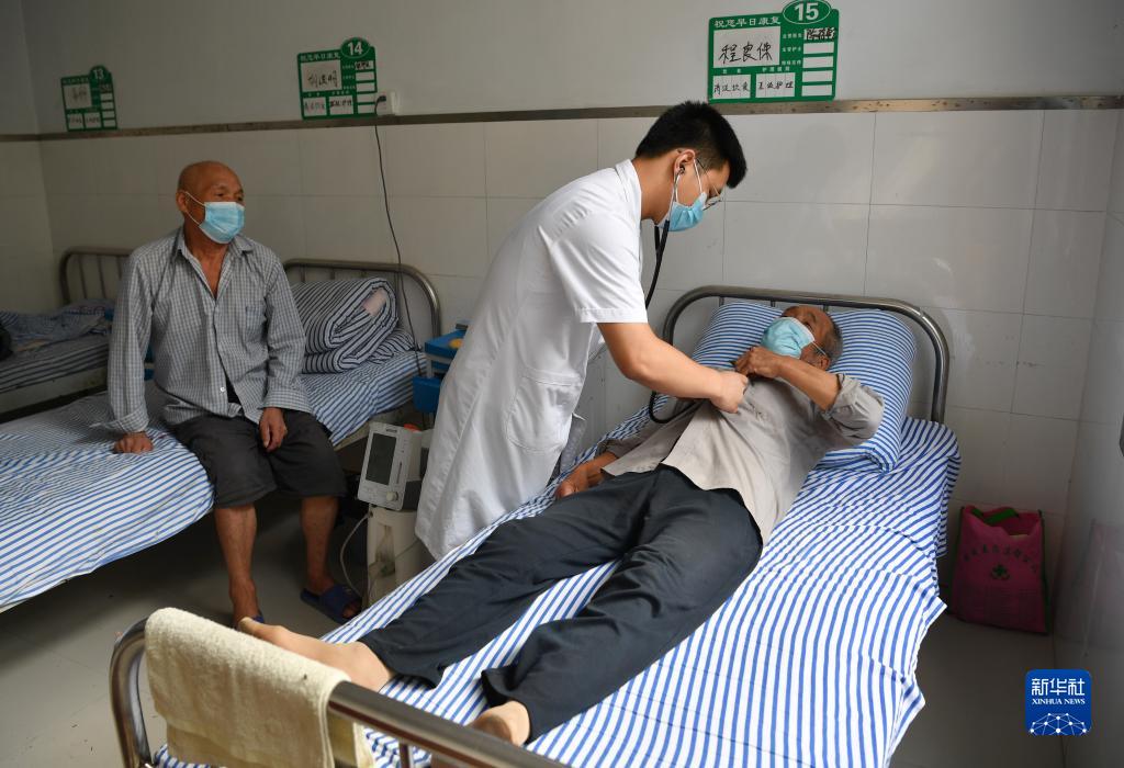 8月16日,老縣鎮中心衛生院的醫生在住院病房?jì)葘颊哌M(jìn)行檢查。