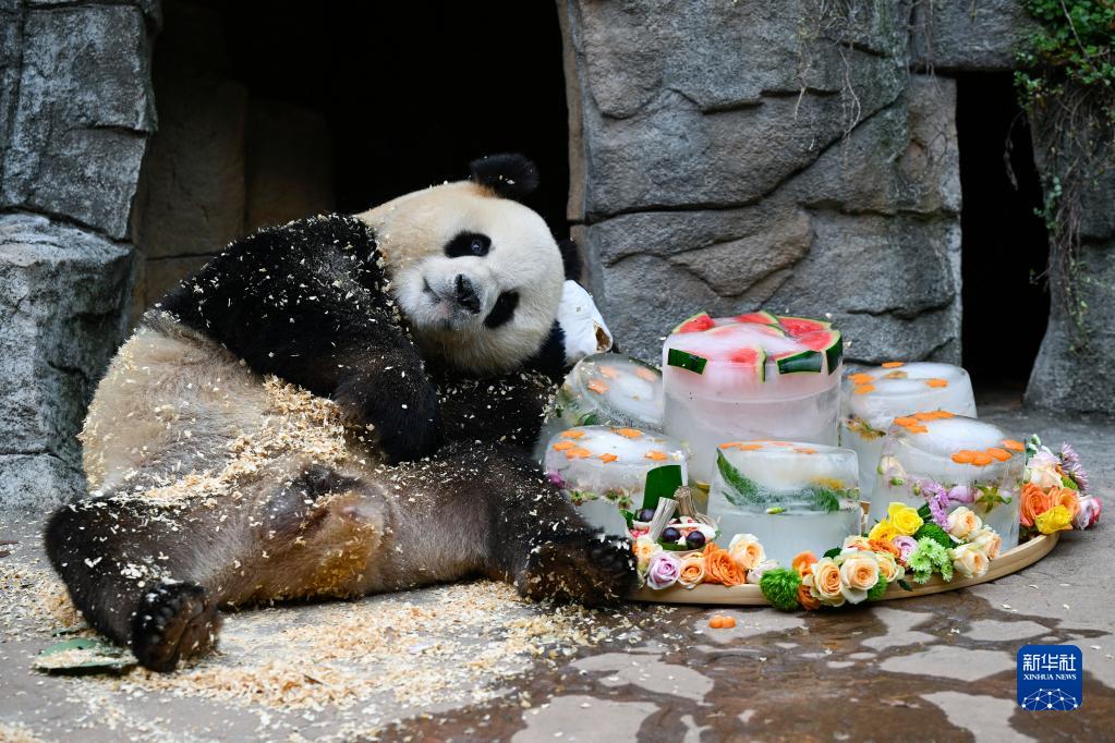 8月18日,中國大熊貓保護研究中心都江堰基地7歲的雄性大熊貓“青青”在享受清涼生日美食。