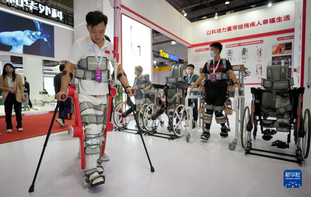 8月18日,參展商在試用下肢外骨骼康復訓練機器人。