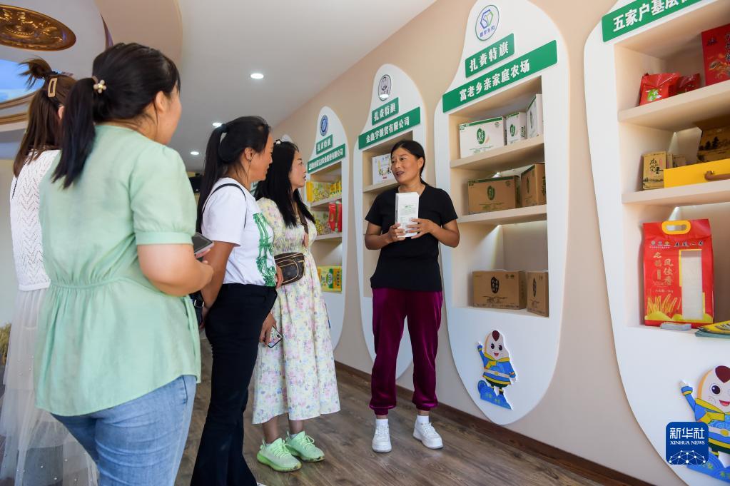 8月17日,在扎賚特旗好力保農業(yè)專(zhuān)業(yè)合作社的大米展廳,宋春平(右)向游客介紹大米展品。