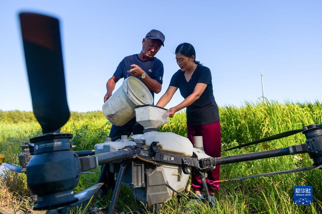 8月17日,在扎賚特旗先鋒村,宋春平(右)與水稻訂單種植戶(hù)開(kāi)展施肥準備工作。