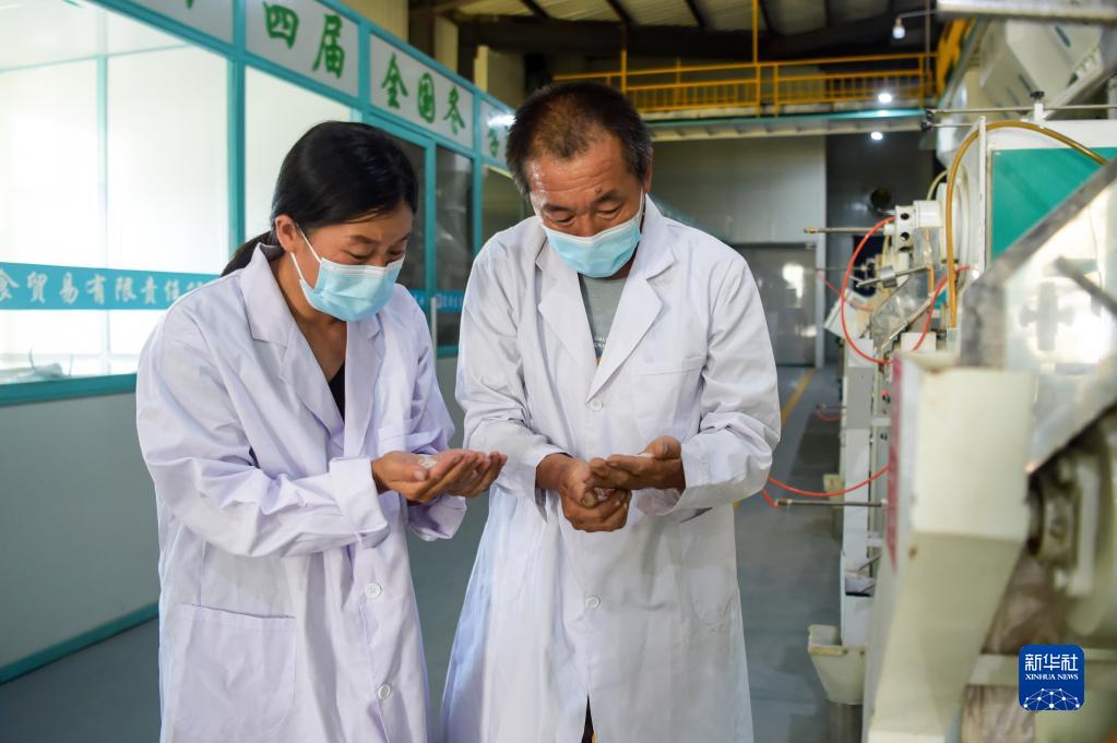 8月17日,在扎賚特旗好力保農業(yè)專(zhuān)業(yè)合作社的大米加工廠(chǎng),宋春平(左)查看大米品質(zhì)。