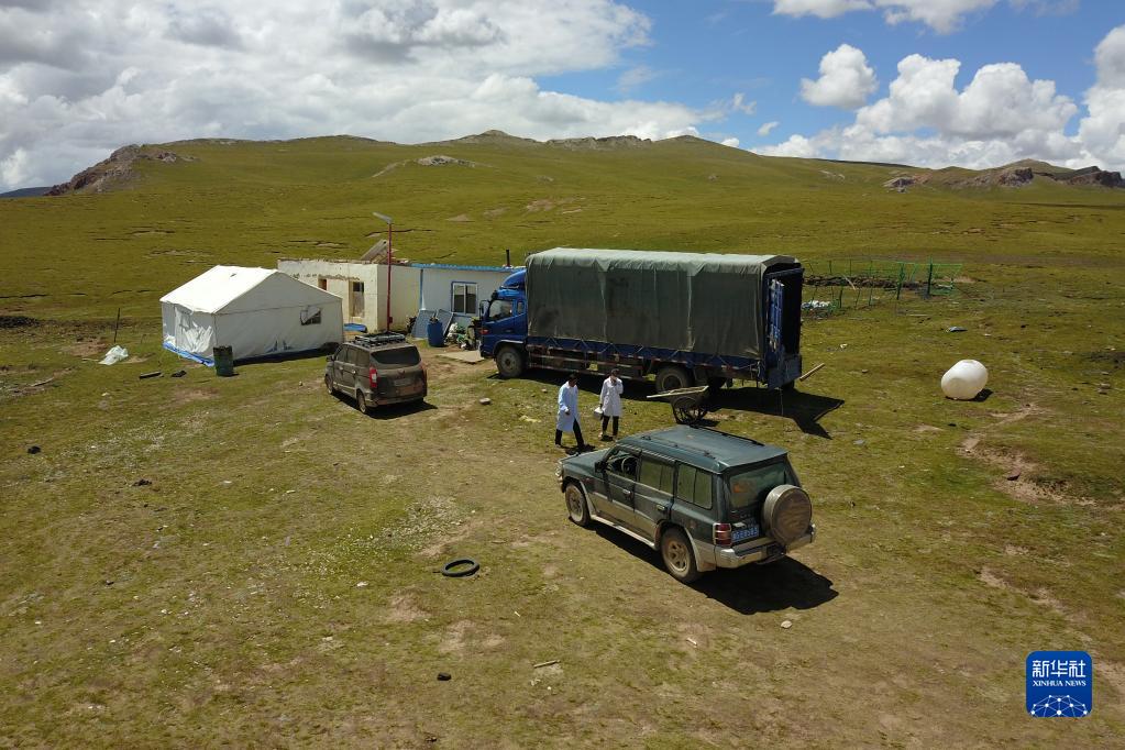 在治多縣索加鄉當曲村,布久索南更青(左)和同事一起前往牧民家中問(wèn)診(8月11日攝,無(wú)人機照片)。
