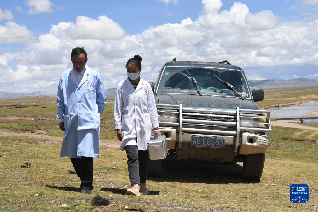 在治多縣索加鄉當曲村,布久索南更青(左)和同事前往牧民家中問(wèn)診(8月11日攝)。