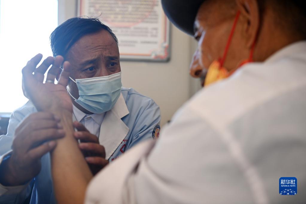 在治多縣索加鄉衛生院,布久索南更青(左)為患者把脈(8月11日攝)。