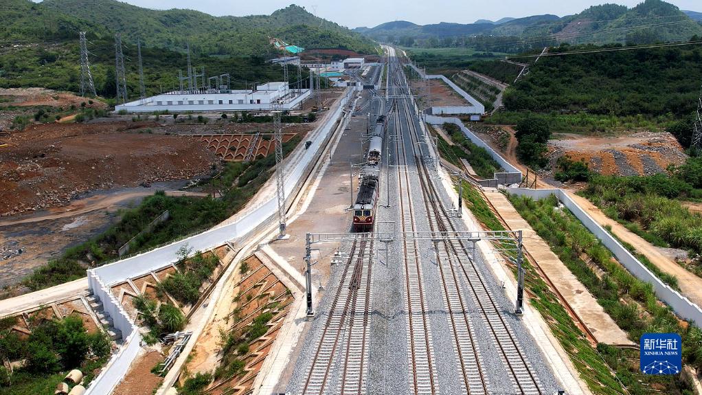 8月18日,南崇鐵路聯(lián)調聯(lián)試綜合檢測車(chē)在線(xiàn)路上運行(無(wú)人機照片)。
