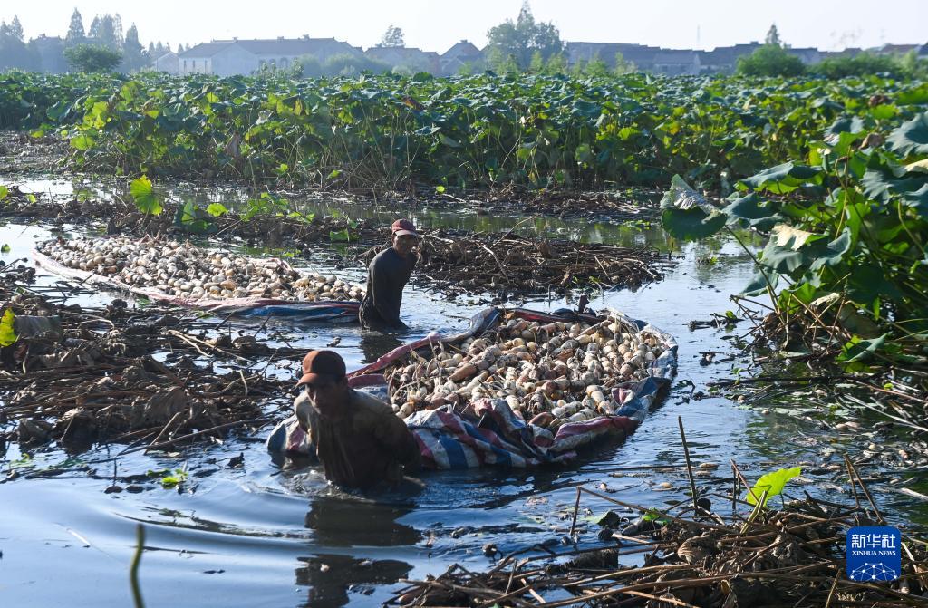 8月19日,種植戶(hù)把收獲的新鮮的蓮藕運往岸邊,進(jìn)行稱(chēng)重打包。