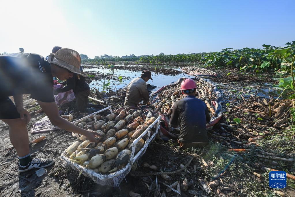 8月19日,種植戶(hù)把收獲的新鮮的蓮藕進(jìn)行稱(chēng)重打包。