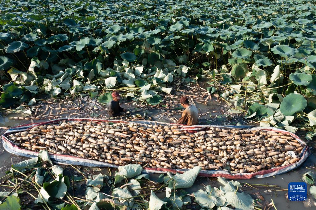 8月19日,種植戶(hù)在藕塘里收獲新鮮的蓮藕(無(wú)人機照片)。