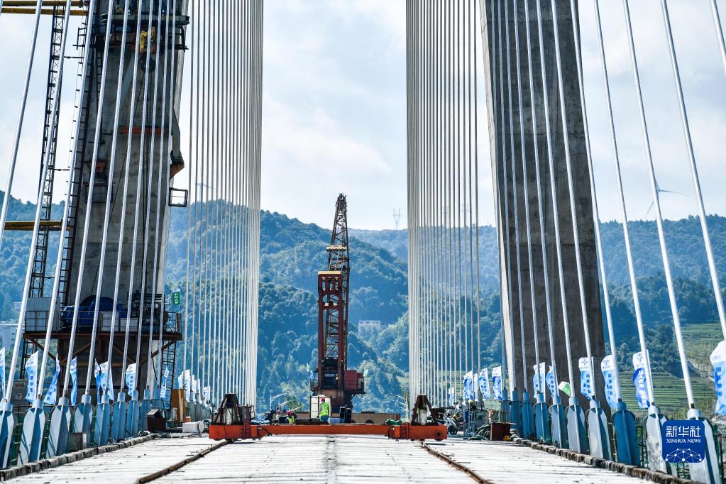 8月19日,工人在合龍后的貴州龍里河大橋上對附屬工程進(jìn)行施工。