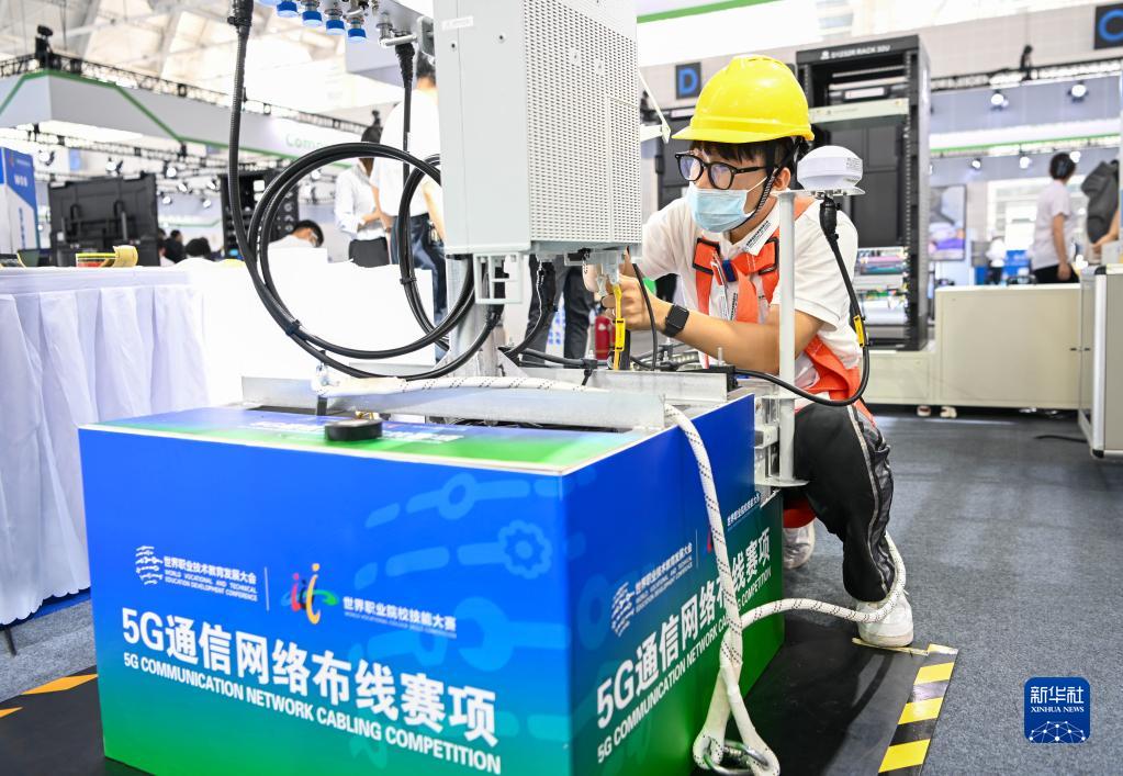8月19日,在國家會(huì )展中心(天津),首屆世界職業(yè)院校技能大賽的參賽選手在進(jìn)行5G通信網(wǎng)絡(luò )布線(xiàn)賽項展演。