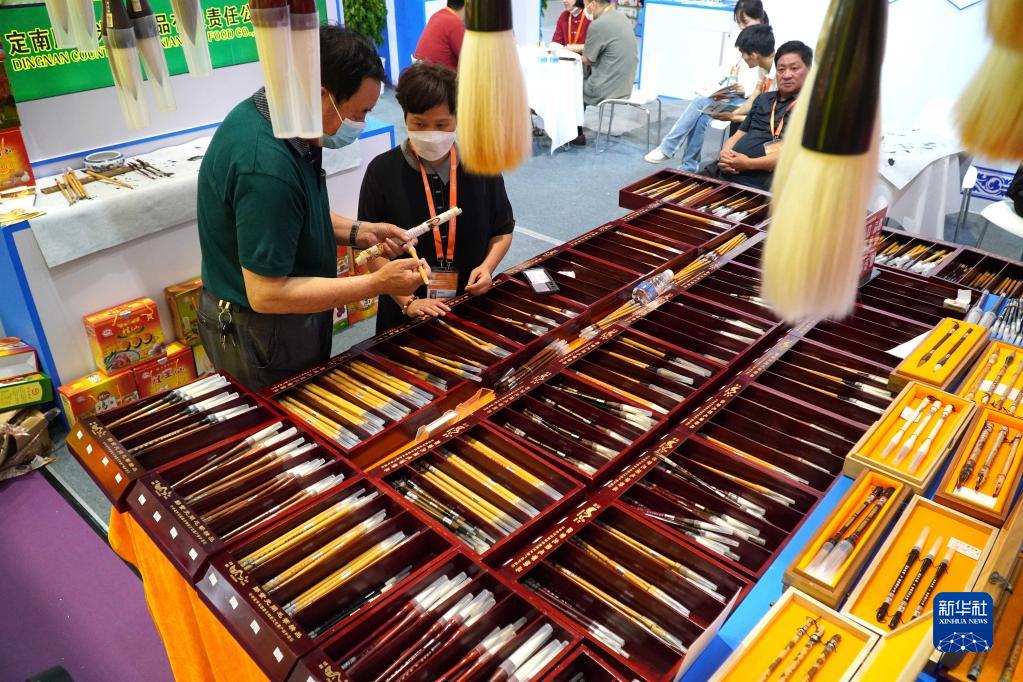 8月19日,在第六屆中華老字號(山東)博覽會(huì )江西展區,參觀(guān)者在觀(guān)看毛筆類(lèi)展品。