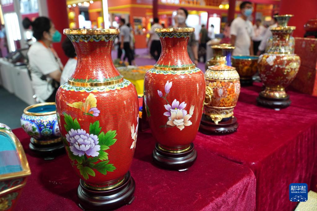 8月19日在第六屆中華老字號(山東)博覽會(huì )北京展區內拍攝的琺瑯工藝品。