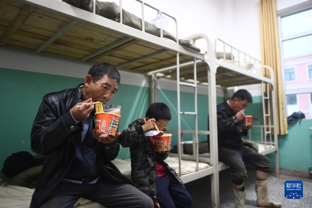 8月18日,來(lái)自青山鄉龍臥村的全海山(左)在大通一中臨時(shí)安置點(diǎn)宿舍內吃晚餐。