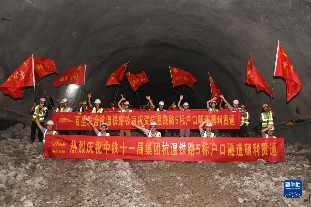8月19日,中鐵十一局建設者在杭溫鐵路戶(hù)口隧道慶祝順利貫通。