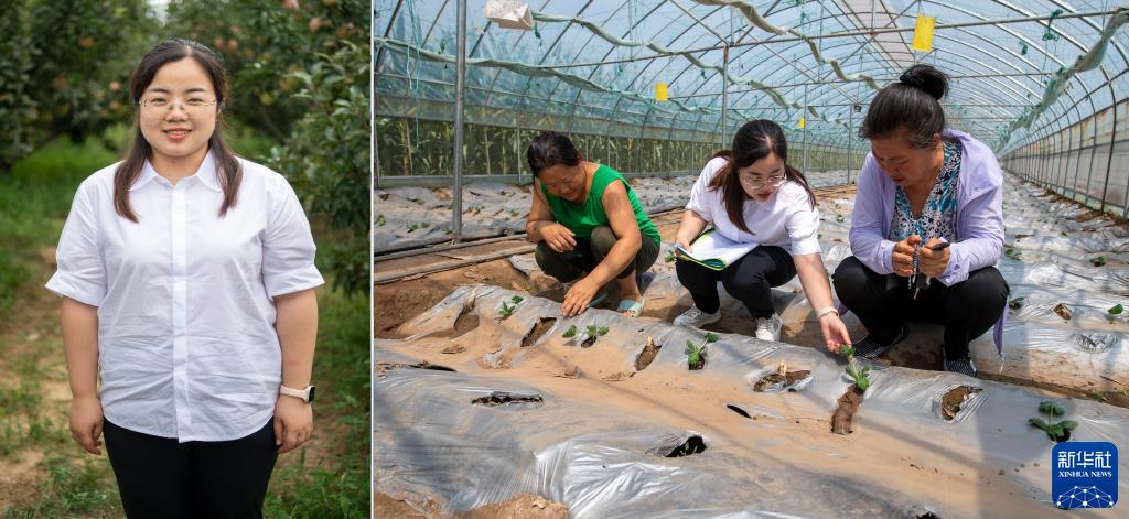 拼版照片:左圖為任村鄉碩士宣講團成員翟亞輝;右圖為翟亞輝(中)在任村鄉東賈村的大棚里向村民講解防治病蟲(chóng)害知識(8月19日攝)。