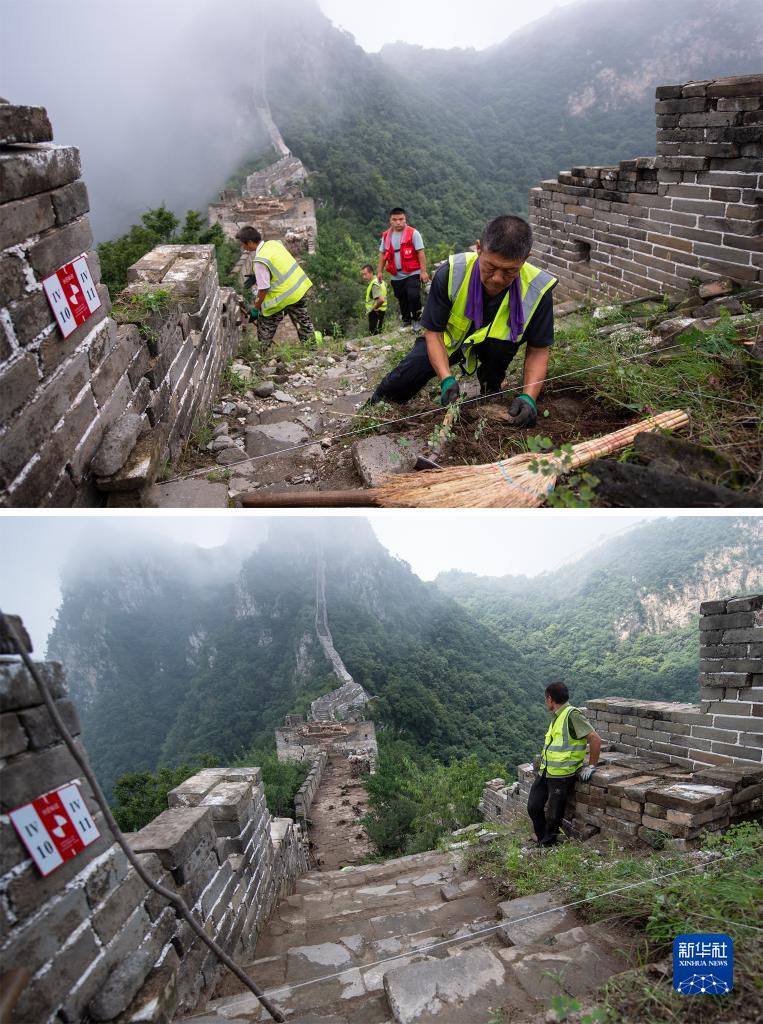 這是一張拼版照片:上圖是工人在研究性修繕段的一處工地開(kāi)始進(jìn)行考古發(fā)掘;下圖是工人在進(jìn)行部分發(fā)掘工作后,清理地面并收集了一些相對完整的老磚用于后續修繕(8月17日攝)。