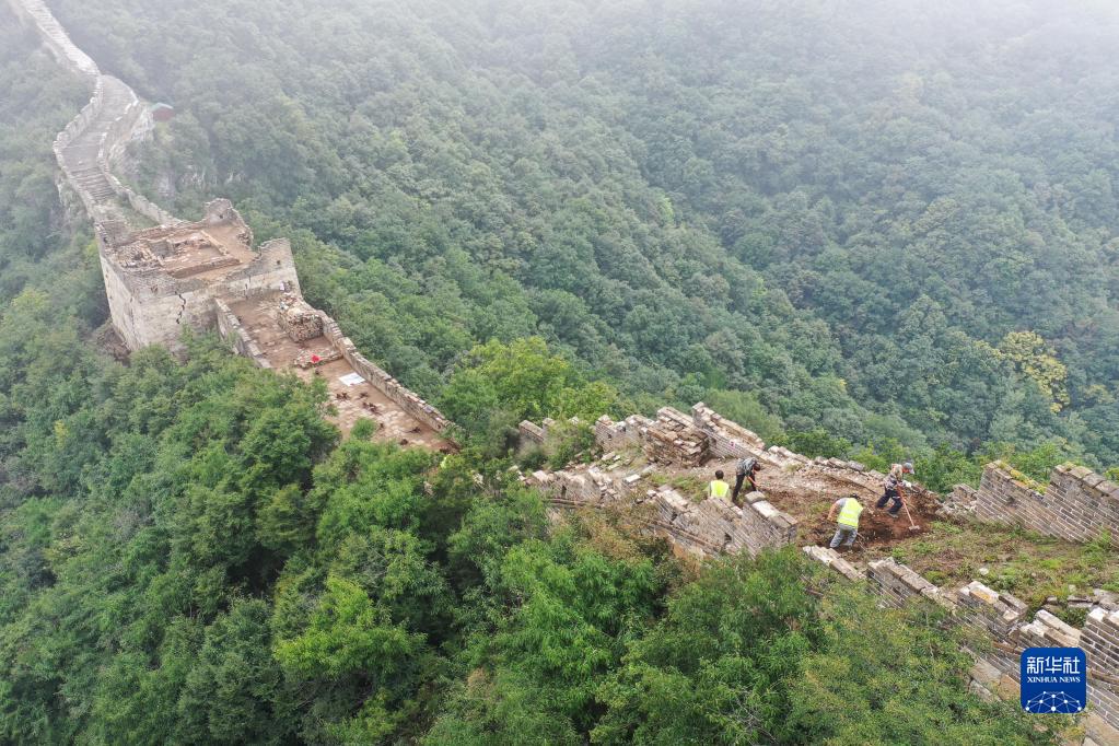 工人在研究性修繕段145號敵臺附近的墻體上進(jìn)行考古發(fā)掘(8月17日攝,無(wú)人機照片)。