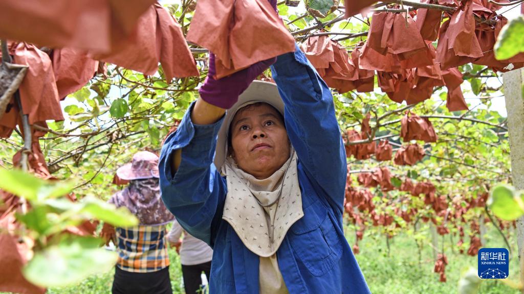 在廣西融安縣大良鎮石門(mén)村獼猴桃種植園,村民在采摘獼猴桃(8月20日攝)。