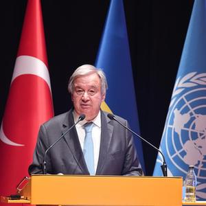8月20日,在位于土耳其伊斯坦布爾的土耳其國防大學(xué)內的黑海糧食外運聯(lián)合協(xié)調中心,聯(lián)合國秘書(shū)長(cháng)古特雷斯出席新聞發(fā)布會(huì )。