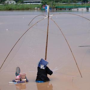 8月20日,在老撾萬(wàn)象,漁民在漲水的湄公河上捕魚(yú)(無(wú)人機照片)。