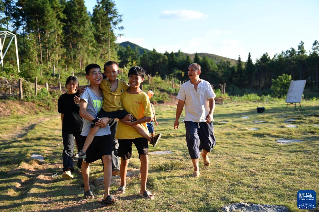 8月19日,劉休(右一)和孩子們在排練戲劇。