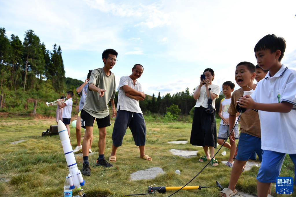 8月20日,孩子們在志愿者的帶領(lǐng)下體驗“火箭發(fā)射”。