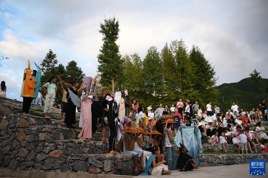 今年7月,附近村莊和鄰近縣市的70多個(gè)孩子參加了大元社的暑期活動(dòng),在完成基本學(xué)業(yè)之余,學(xué)習手工、繪畫(huà)、音樂(lè )等藝術(shù)相關(guān)課程。8月20日傍晚,孩子和村民們一起舉辦的藝術(shù)節便是“結業(yè)典禮”。為了準備藝術(shù)節的重頭戲——沉浸式戲劇,孩子們自己打磨劇本、設計服裝、調試燈光,40多個(gè)孩子穿著(zhù)自己設計的服裝,期待著(zhù)屬于他們的鄉村藝術(shù)節。